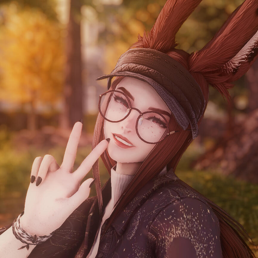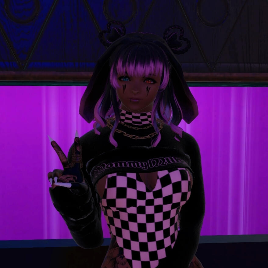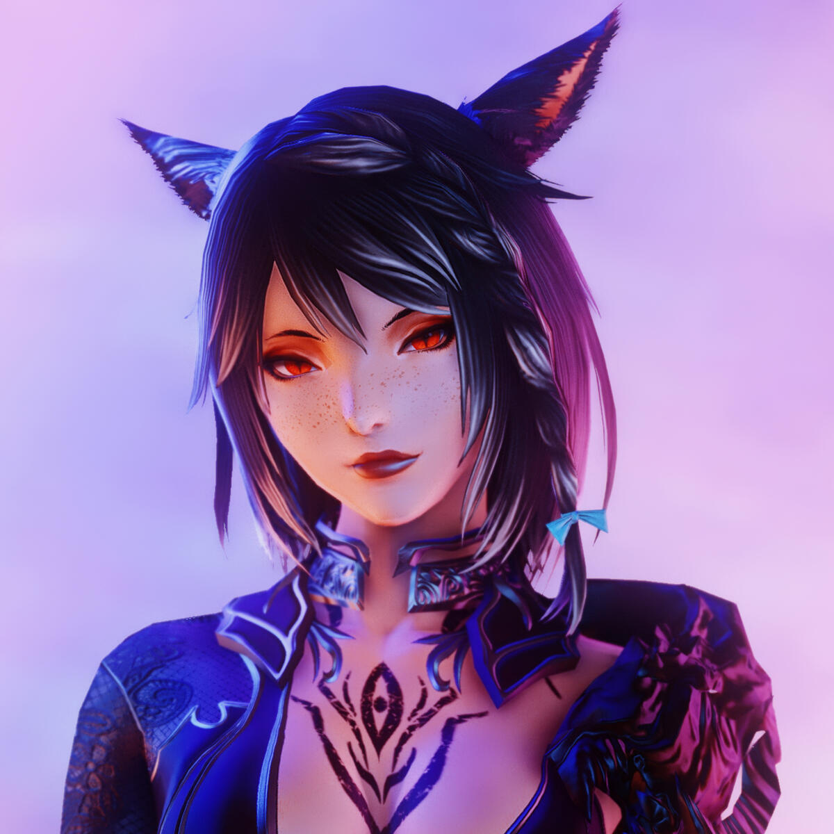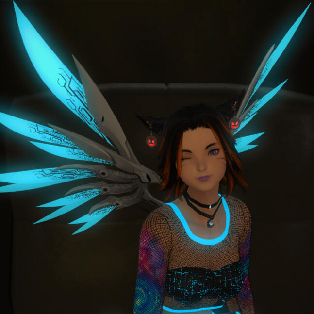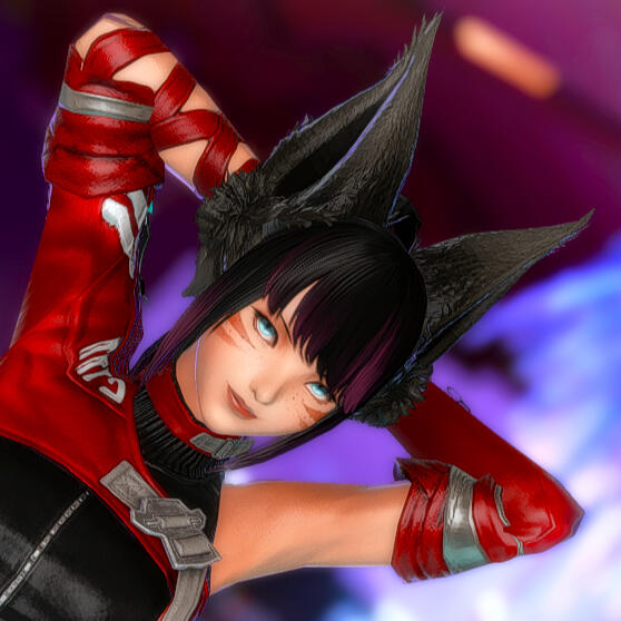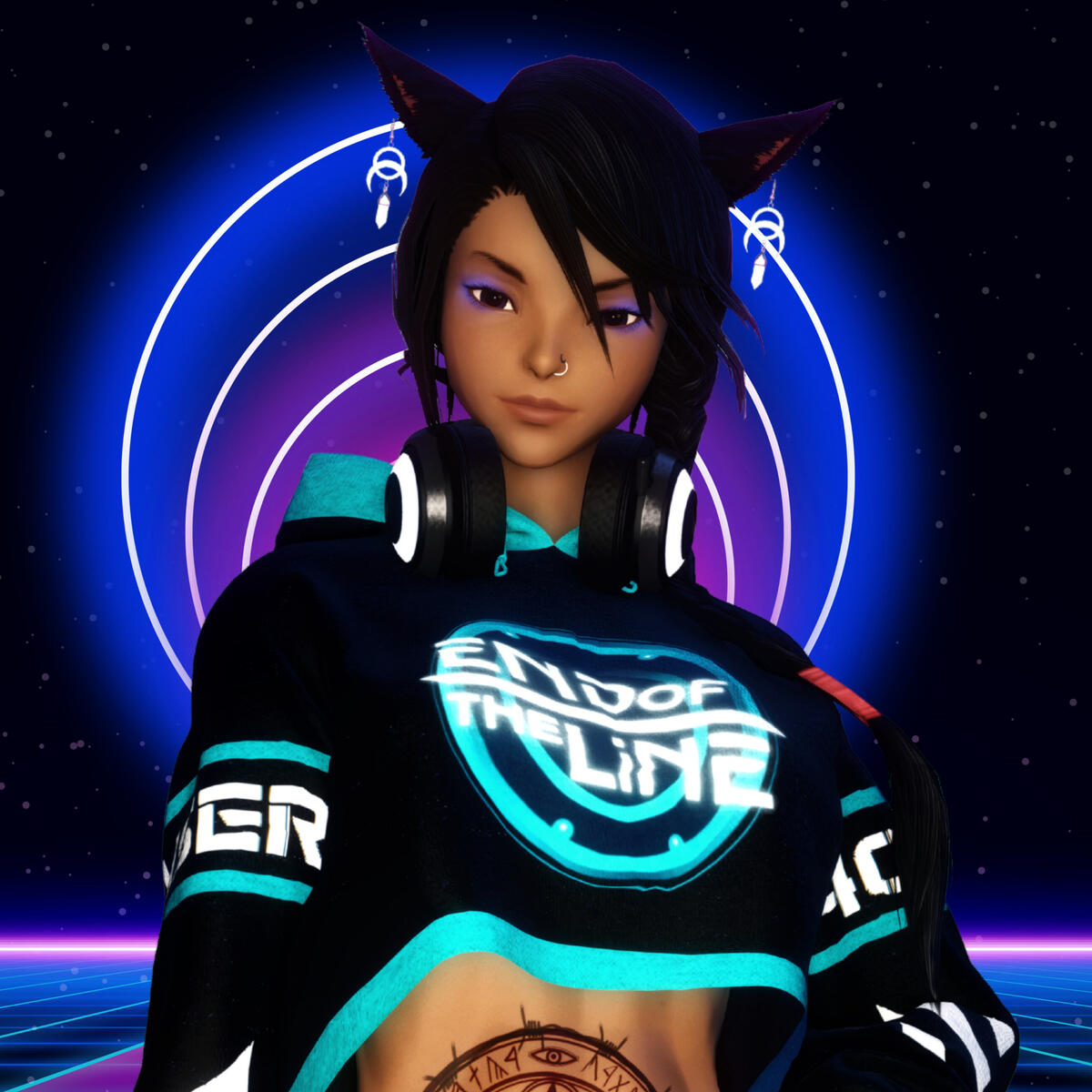 Mandy is a small Au'Ra with a mischievious, playful, and affectionate personality. She loves to spend time with her friends, gpose, and cheer her favorite DJs on. She's very fond of fighting games and will Totsugeki you if you break the venue rules.